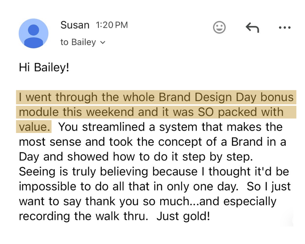 Wow! What can I say except…if you’re thinking about this course then I highly recommend you take the leap. Bailey has a way of explaining things that just makes sense and takes the pressure off. She gives you all the nuts and bolts to make design days happen for you biz. Nothing is left out. She shares all her tips and tricks. Finally a course that lays it alllll out there. No fluff and also nothing to be left wondering about. You’ll have exactly what you need to implement this process!