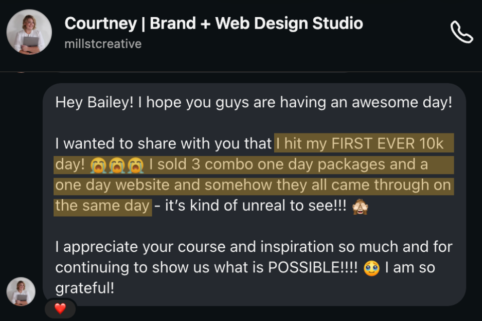 Even if you start at the same $800 I did, you only need to book three Design Days ($800 × 3 = $2,400) to make back your entire investment AND MORE in this course. And once you lock in your process and raise your rates (like I did), you’ll likely be doubling or tripling this investment in a single day.
